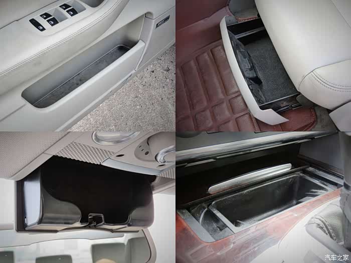 奥迪A6L的绝大多数储物空间中都覆盖了植绒材质,深色的还好,像门板上的储物格中使用的浅色材质就很不好清理。前排座椅下面的抽屉是个比较有特色的储物空间,当随身携带金条的时候,往这里面一放会感到非常踏实...
