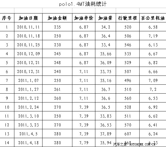 3、驾驶习惯对油耗有很大影响。暴力驾驶明显比温柔驾驶油耗高。下表中2011.1.7一箱油驾驶比较猛,所以油耗 比较高,7.09。平时起步比较稳的油耗就低了0.5-1个左右。