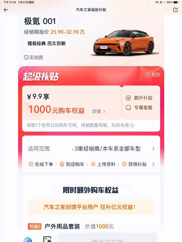 在注册汽车之家的时候,我无意中发现了极氪001的购车优惠活动,9.9元盲盒抽奖吸引了我的注意。