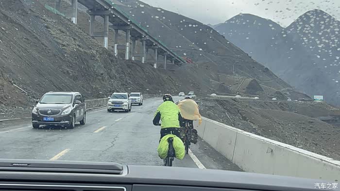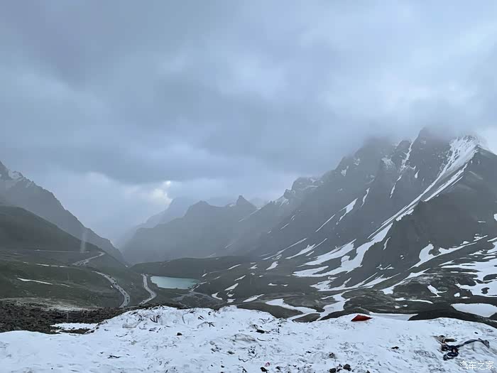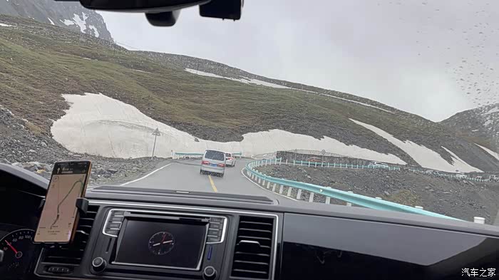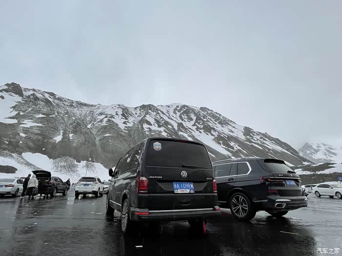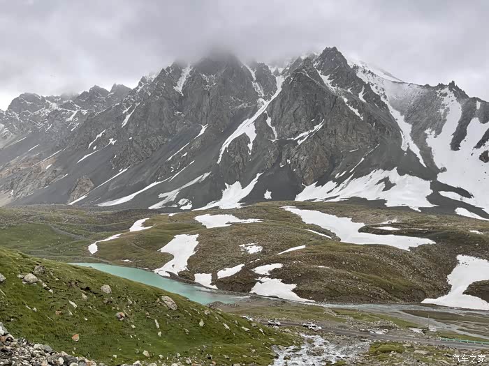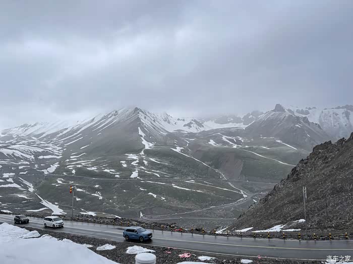 到达山顶修整一番后,天气渐暗,我们要继续赶路,计划晚上到达唐布拉,随机选地休息啦。经过哈希勒根隧道时,真的是用大雨倾盆形容一点都不为过,在个别一小段路段,感觉雨刷都不起作用了。一天有四季,十里不同天。独库公路果然没有让我们失望。