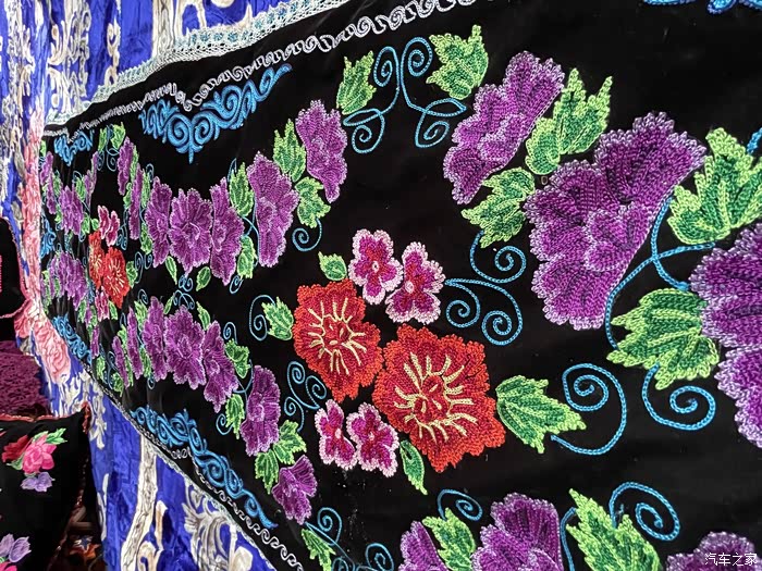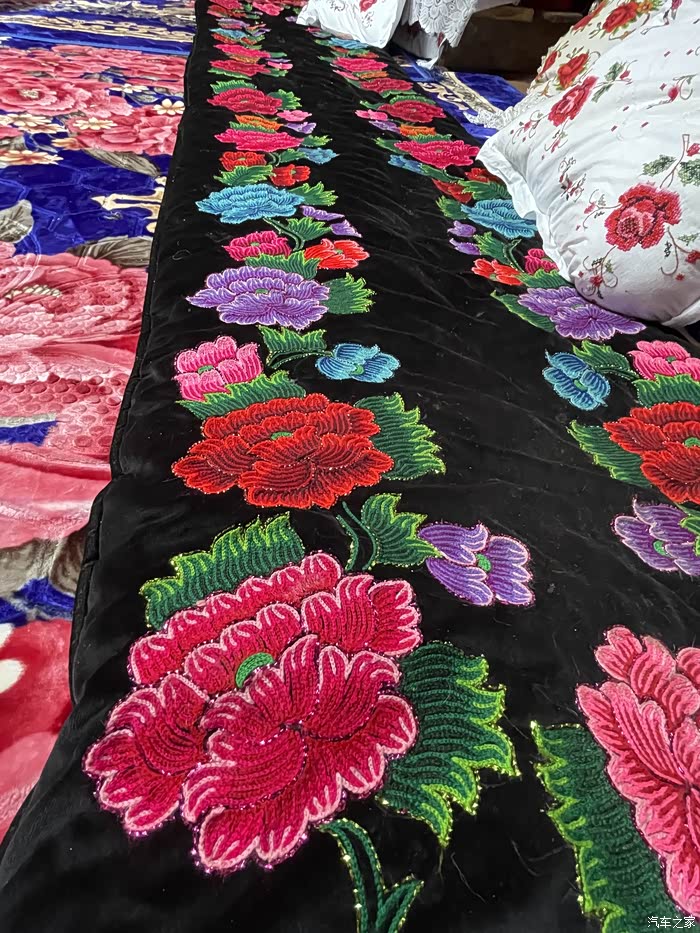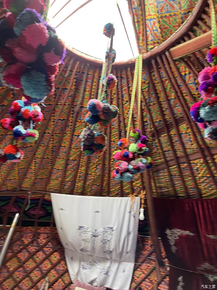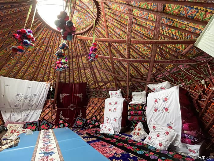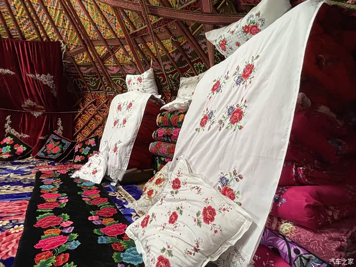 中午,我们打算在牧民家吃饭。哈萨克牧民招呼我们进到他们的蒙古包时,我真的被惊艳了。大通铺上堆砌的干净整洁的被子,还放了很多民族特色手工刺绣装饰。蒙古包中间悬挂的吊饰也是手工制作,细看就能感受到女主人对生活的那份热爱。突然就想起了《我的阿勒泰》里的托肯,虽然被生活忽视,不受尊重,执着于那块搓衣板。但并不妨碍她穿上漂亮的花裙子,在舞会上大声说出“我的小叔子,最帅。”他们都是不善言辞,不善表达的普通人,在琐碎的生活中,却将热爱放在了生活中的点点滴滴上。
