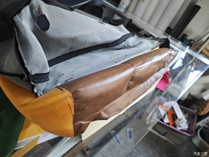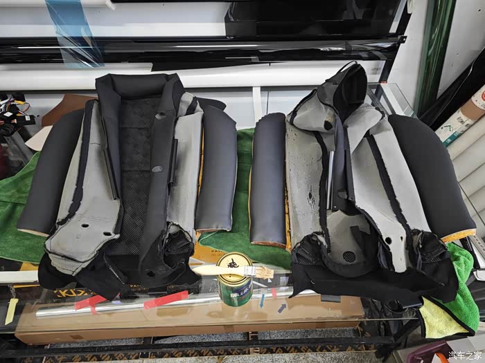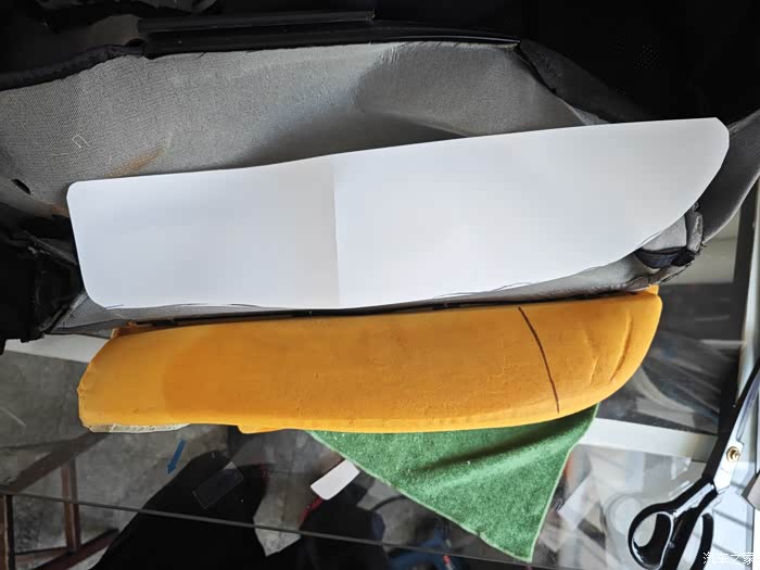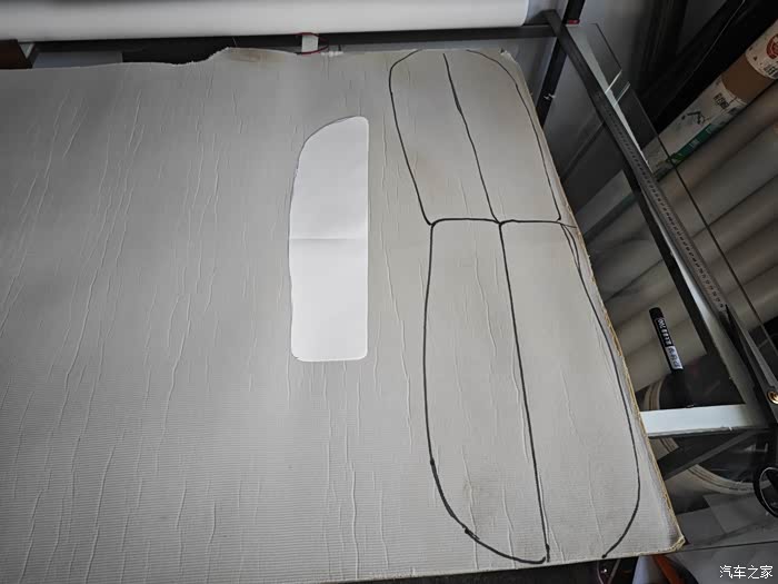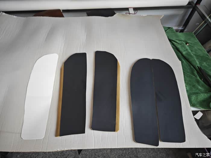 然后用完好无损的另一边打好样板!把座椅两侧凸起的位置 全部加一层厚的超纤皮革!总共四块!准备下料