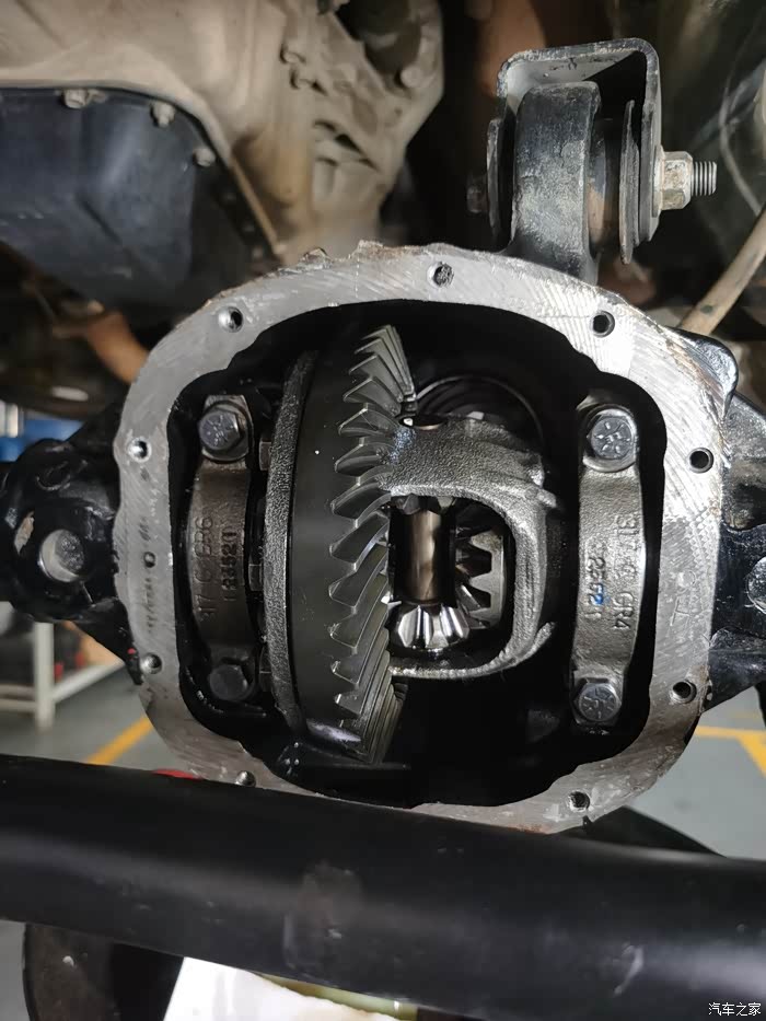 对面的牧马人正在保养前桥,近距离看一下撒哈拉的开放式差速器,坦率的讲,看着还不如纳瓦拉的精致,也是不带限滑,不带锁的纯开放式差速器