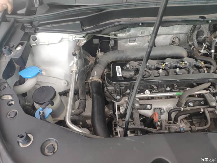 这个是刚打开发动机舱的样子,看到里面还是比较脏的,上面很多的灰尘。这些灰尘就是我们平时开车的时候,通过发动机上下面的散热地方跑上来的。然后附着在这些表面上久了没有做清洁的话,就成这样子