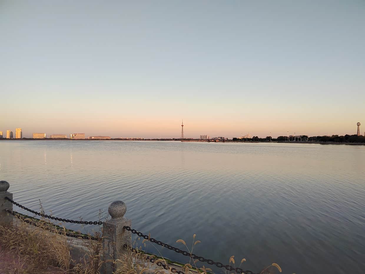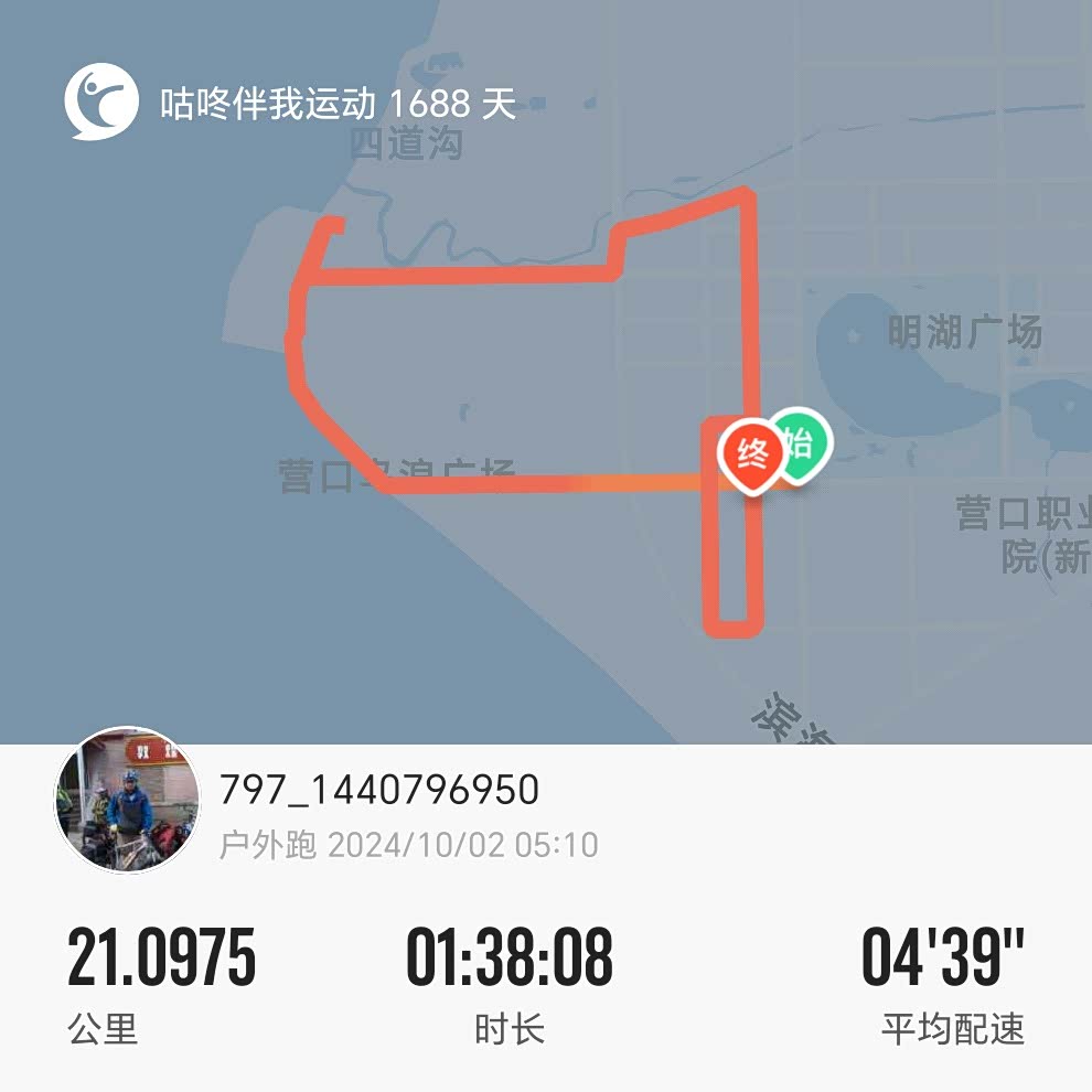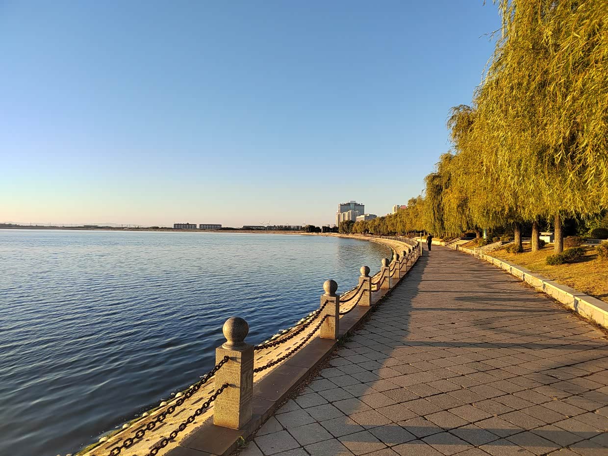 十月三日早上自已跑步来到酒店附近的明湖广场,大辽河水引流的湖水,跑了一大圈,8公里。
