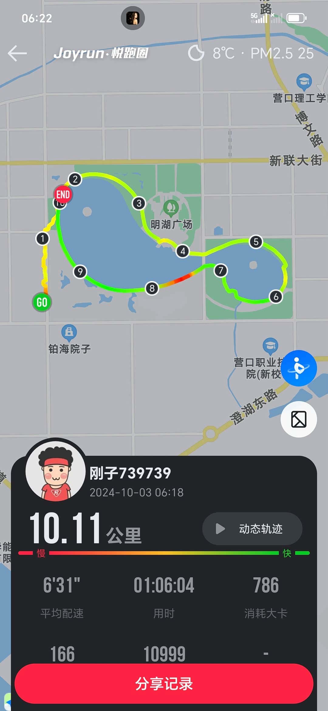 庆祝祖国75华诞,下夜班早上特意在单位跑了一个10.01,以表示庆祝。