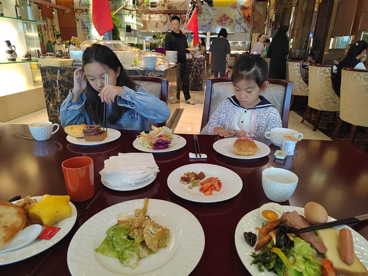 酒店早餐是孩子最喜欢的。大宝半价28元,小宝免费。