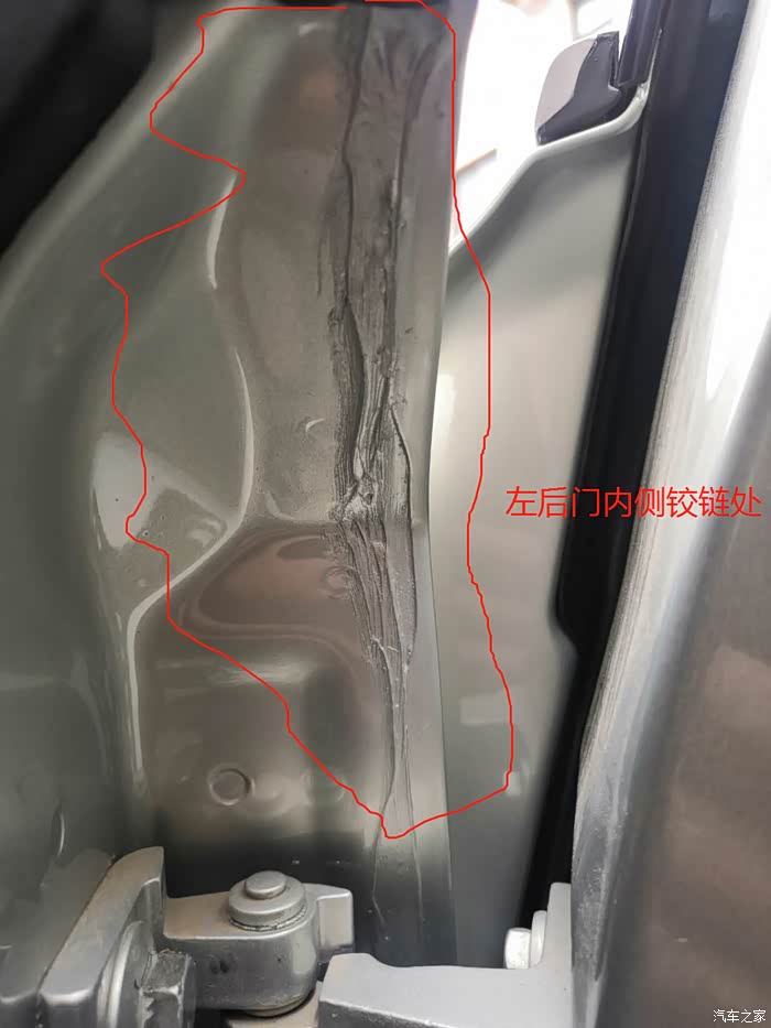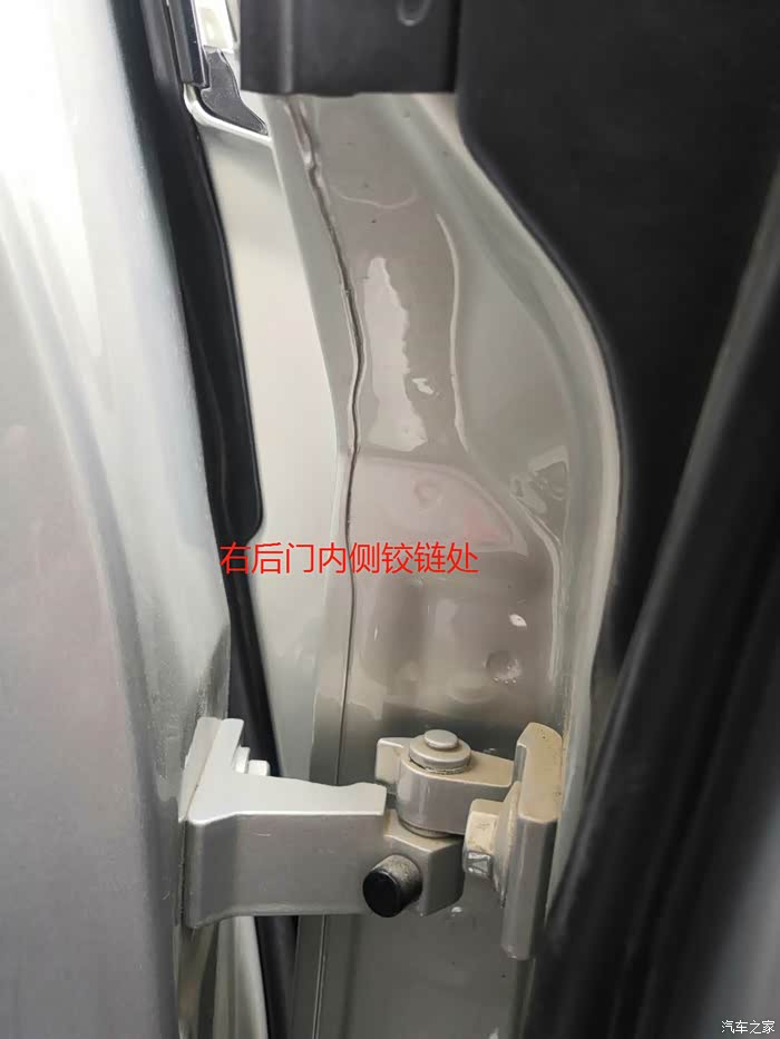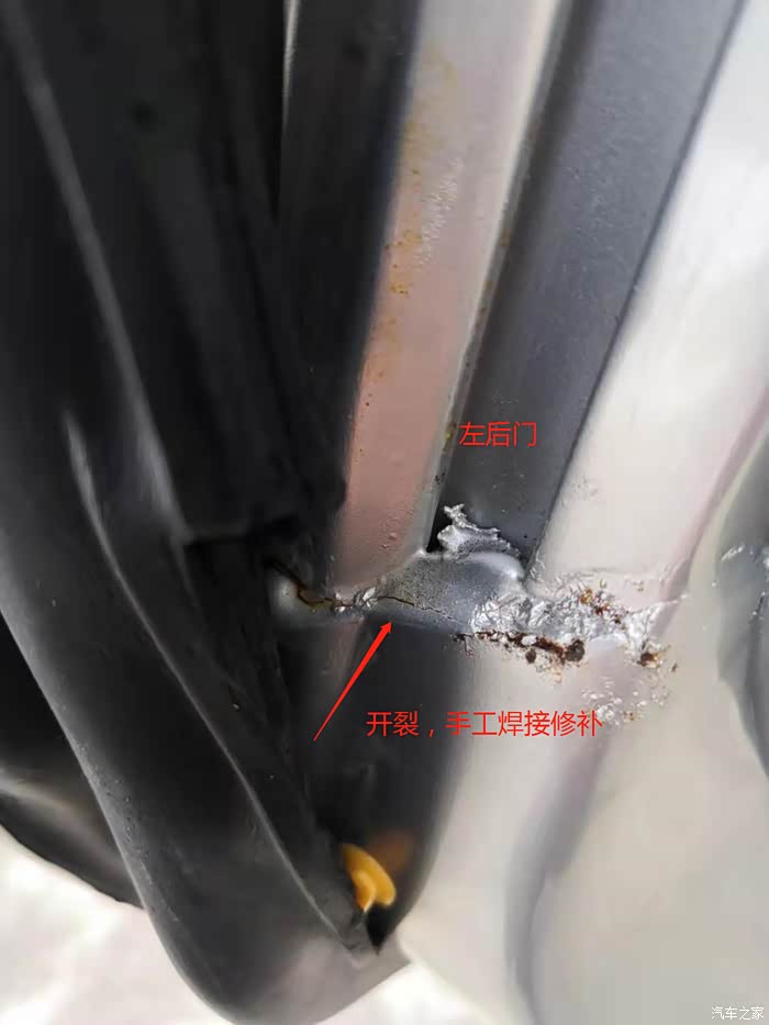 后门左右侧对比,右门机械焊接光滑完整无锈蚀现象,左门焊接开裂修补痕迹明显,已有锈蚀现象。