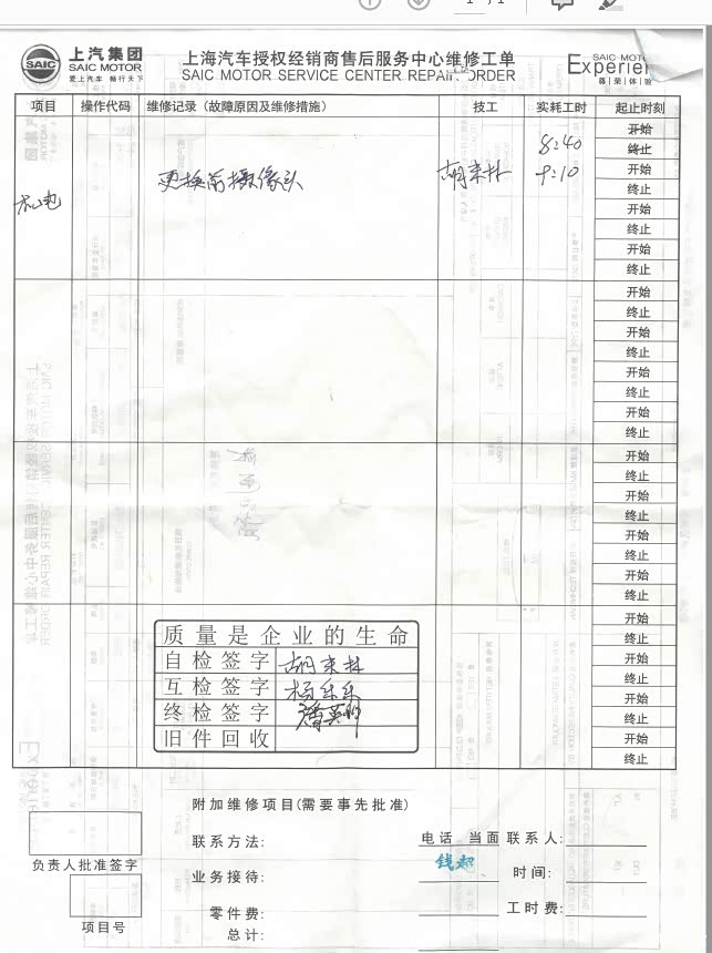 2018-3-22在上海永达荣威汽车销售服务有限公司下购买订单,车型为ei6互联至尊版,4月10号销售说车辆已出厂在运输途中,之后多次问及车辆状态,均回答在途中,运输时间达三周之长。行驶证时间为5月7号。6月中旬车载充电器在充电过程中多次在未充满的情况自动断电,联系4S后说可能需要刷新系统,在店里停了一天。7月初发现前摄像头清晰度很差,无法正常使用,去4S店更换摄像头(第一次更换)。而后在9月出现充电同样的问题,充电未满情况下自动断电,再次去4S刷新。至10月份同样的问题又出现了,未充满自动断电,直接致电荣威厂家热线反馈问题,而后4S主动联系我,去4S店更换车载充电机。更换时间为2018-10-20。在2019年春节前发现更换的前置摄像头又存在模糊,无法正常使用的情况,在过年后又去了4S店,第二次(2019-2-18)更换了摄像头。同时发现驾驶位正后排的车门有维修过的迹象,有裂缝且焊接接头不均匀(与其他车门焊接状态完全不一致),出现了锈斑。车门与车架螺丝有用扳手拧过的痕迹。联系4S无果。