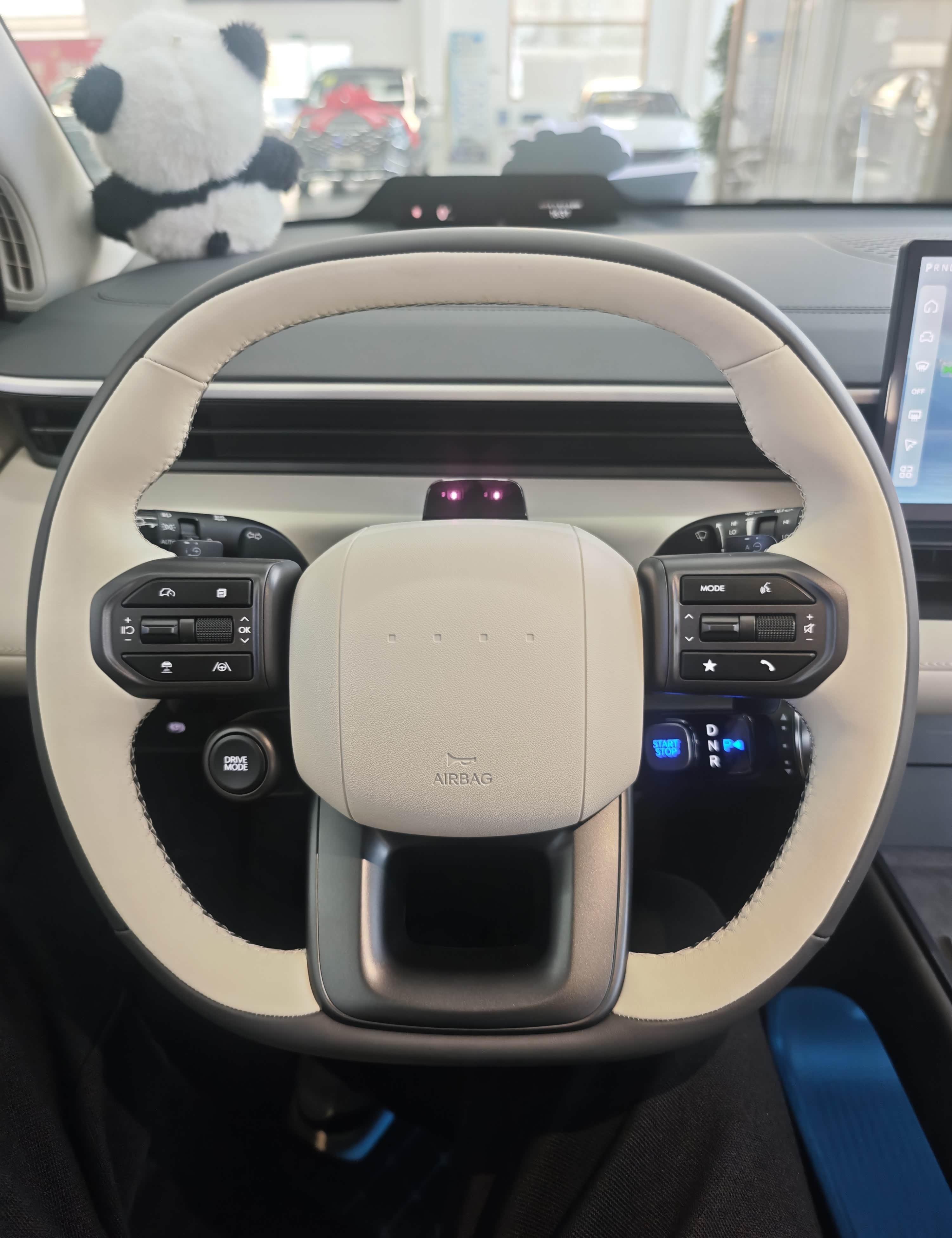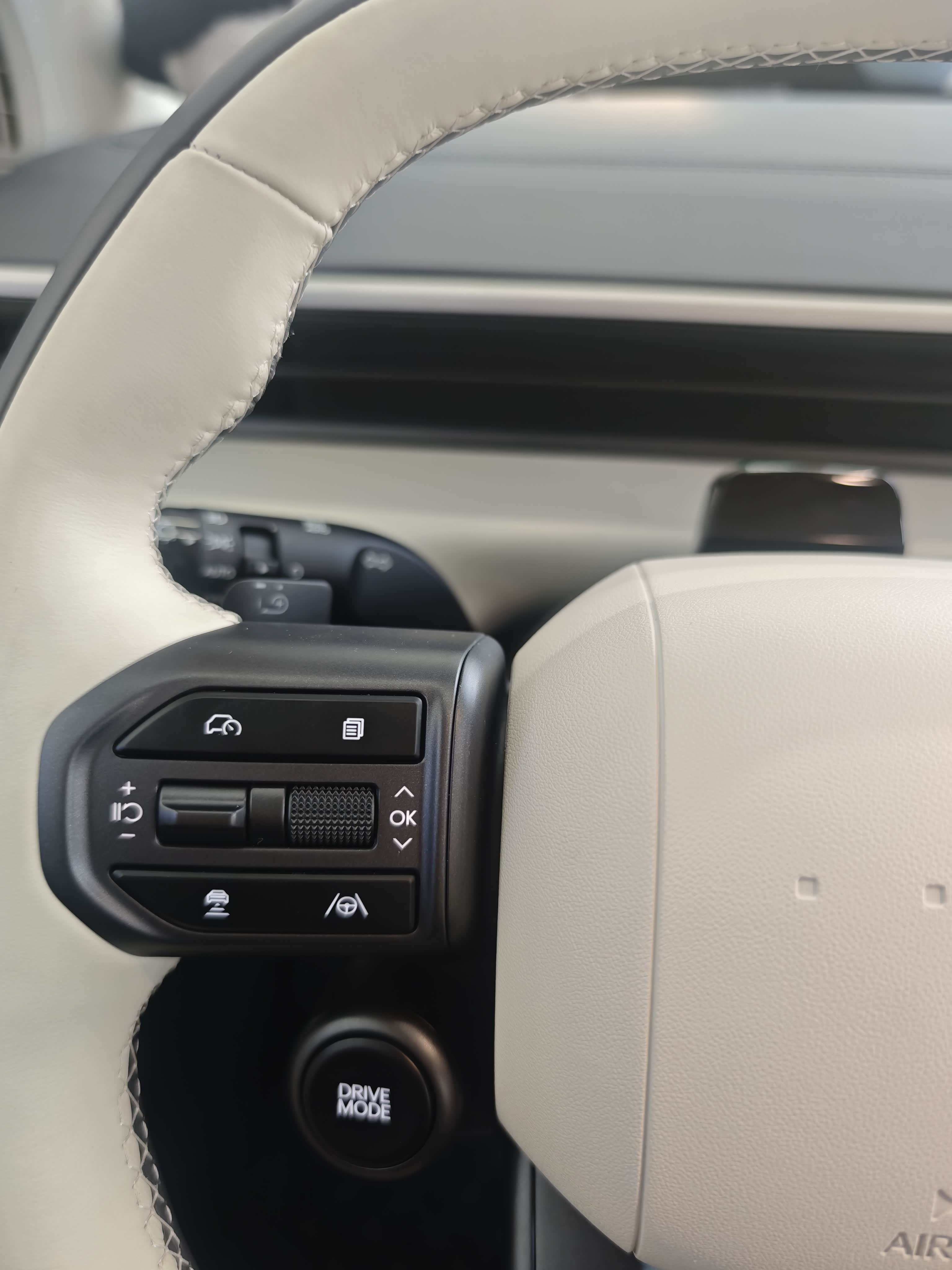 虽然EO只是紧凑型SUV,但在驾驶区域设计巧思还是蛮多的,比如方向盘两侧除了常规的自适应巡航和多媒体控制按键外,在方向盘左下侧还单独设计了类似于性能车的“DRIVE MODE”按钮,驾驶氛围感拉满,个人十分喜欢。
