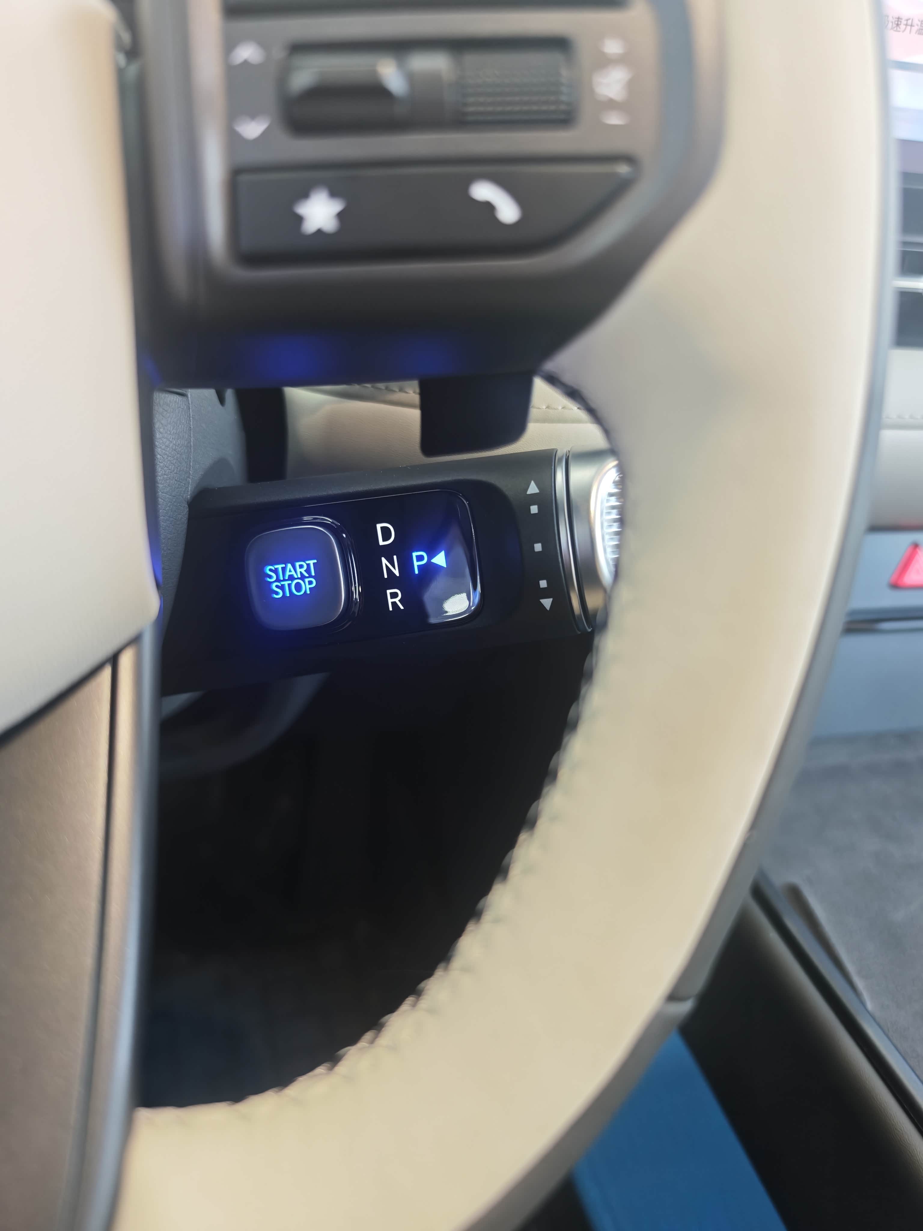虽然EO也使用了目前电车主流的怀挡设计,但是换挡逻辑是前后旋钮,而非上下拨,启动按键则被设计在了档杆的最里侧,这个设计很像他的大哥全新帕里斯帝,相信你第一次上车肯定找不到。