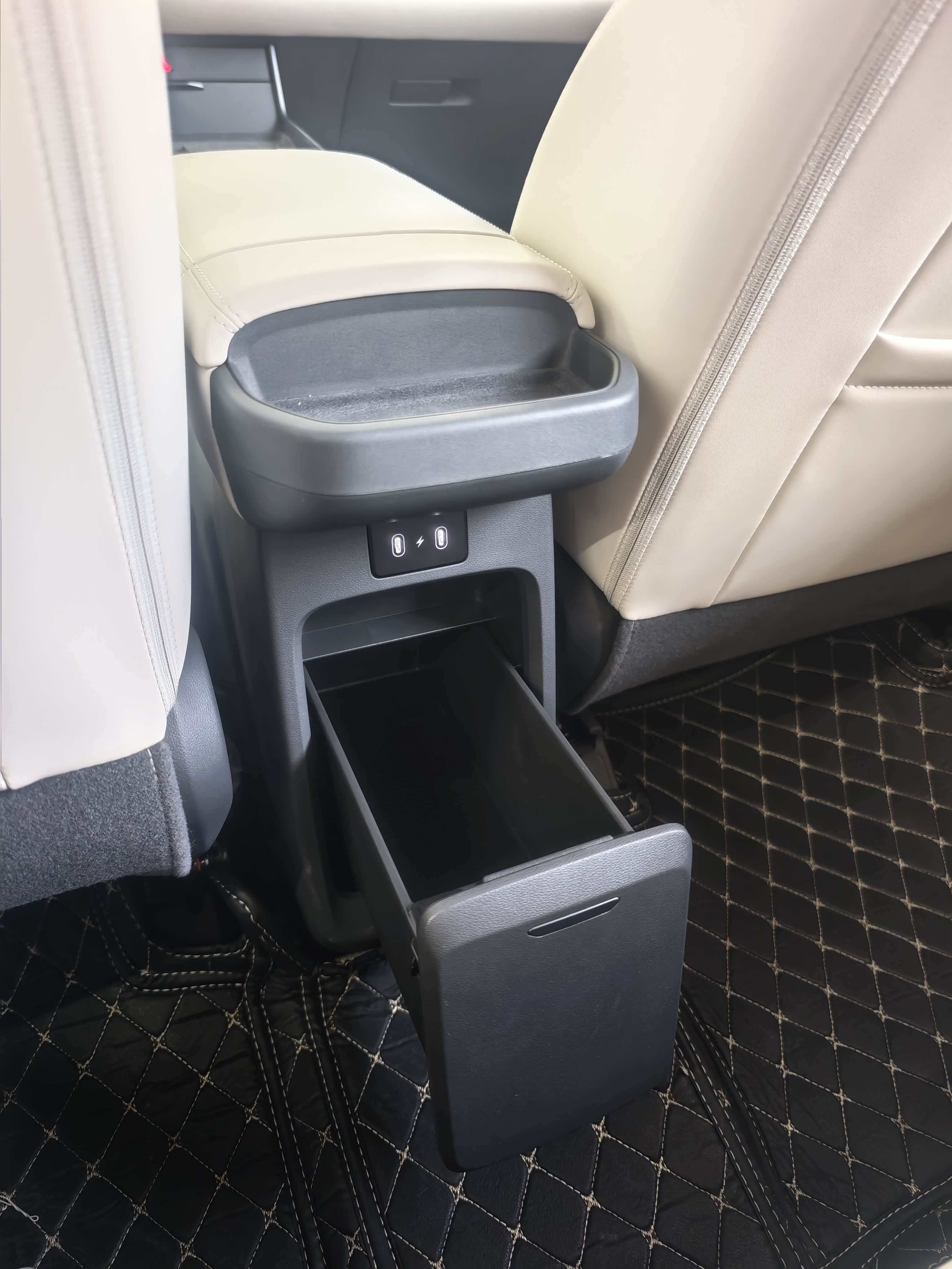 中央扶手后方做了一个向后拓展的储物台,后排乘客放个手机刚刚好。另外,后排中间还有一个超大的储物格,大小在我看来基本和国产新能源MPV车型相当了。
