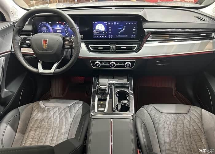 内饰的科技感就体现在屏幕上,两个连屏,它的车机功能一应俱全,像导航啊,听歌啊,包括打开什么天窗啊等等这些都是比较完善的。有一个非常与时俱进的设计就是它前面做了两个放手机的位置,很方便,而且左边这个,是一个40瓦的快充,并且你看有一个大大的透气隔栅啊,手机放在这里不会发热啊,这里还有一个小绿灯会亮起来,表示你在充电,而且这个车在设计这些基础功能性的时候,它不忘做一些设计的仪式感,扶手箱红色的红旗灯条,我的感觉就是豪华而且很精致。
