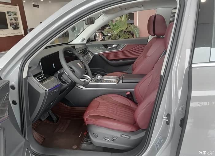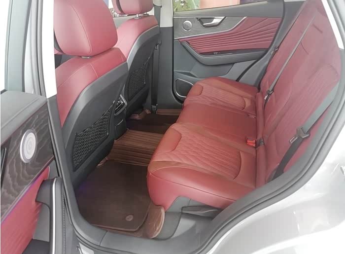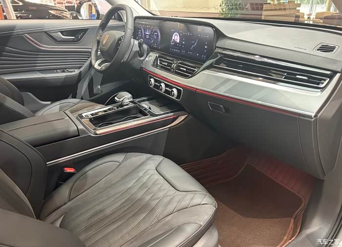 从外观设计延续到内饰,在暗一点的或者晚上开的时候,这个车内饰真的就是很多的那种流光射影的感觉,论用料,论整体的氛围感,高端大气,大面积的木式的饰板虽然用的一些塑料,但摸上去也是手感很好,然后座椅中配以上就有纳帕皮缝制的座椅,而且深红色的搭配显得非常有格调。