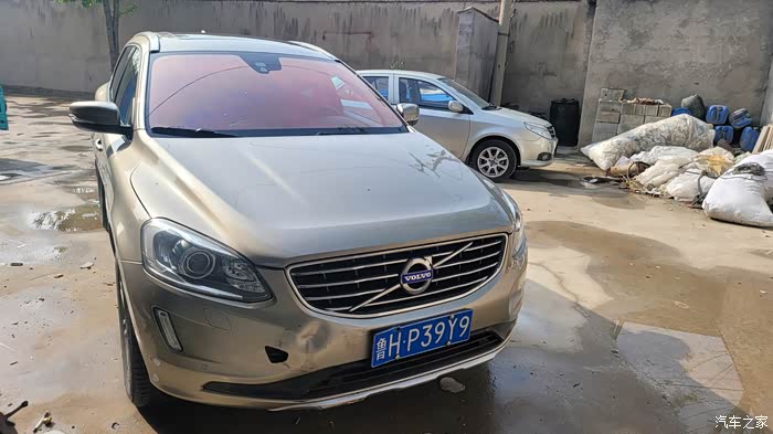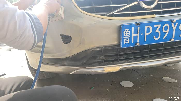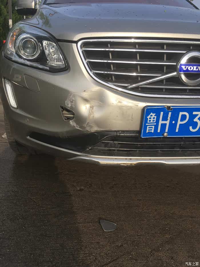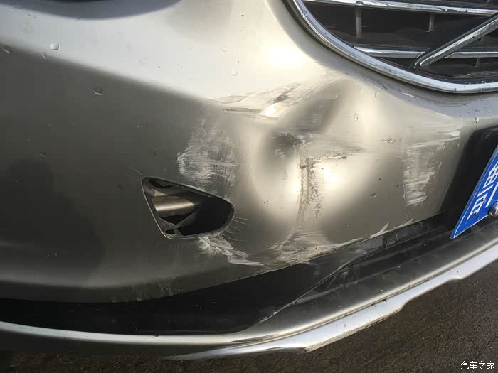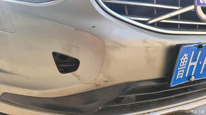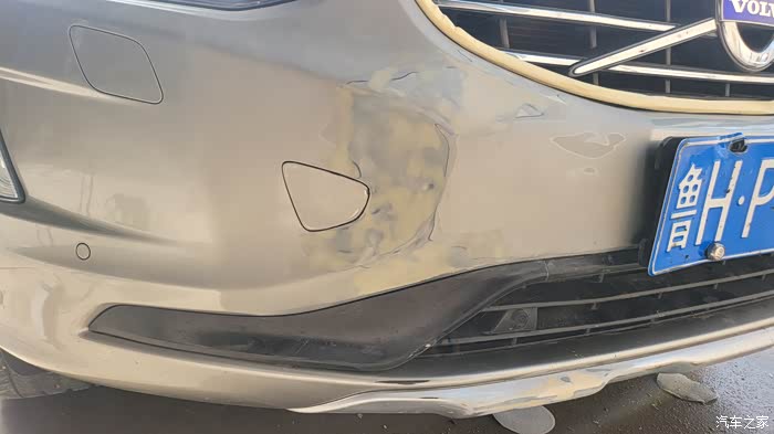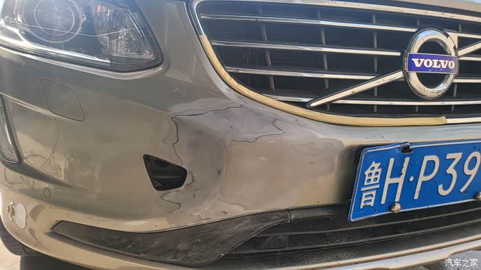 沃尔沃受伤的惨状,右侧前脸下方棱角造型被撞洼,拖车钩盖被撞飞,前唇装死板被撞裂,牌照框被撞烂,紧固螺栓不翼而飞