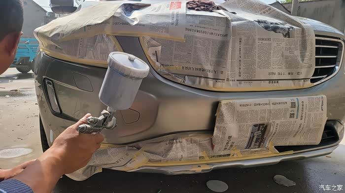 这是喷涂初步完成的状态。在这里严肃提醒各位车友,补漆喷涂过程中,最重要的不是色漆的好坏,而是清漆的好坏,直接决定后期是否会存在巨大色衰甚至爆漆的风险。色漆补喷完成以后调漆喷漆技术好的维修当即是看不出色差的,但是如果用了不好的清漆两个月后就能看到色衰很快,厉害的还会爆漆,清漆相当于一层保护膜把色漆的光泽和鲜艳封存在车身上,小维修铺很难用好的清漆,所以喷涂质量差就在这里,得亏我随车带着一瓶巴斯夫的清漆够用!