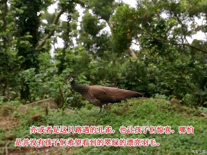 我招呼说还有好多景色,大家就又骑上车进发,漫无目的的开着。突然前面说叫别出声,定睛一看,原来路中间有一只孔雀,大约是一只母的孔雀,因为她并没有翠绿的羽毛和美丽的外表。孔雀似乎并不怕人,独自悠闲地踱着方步。也许知道我们这些游人并无恶意。