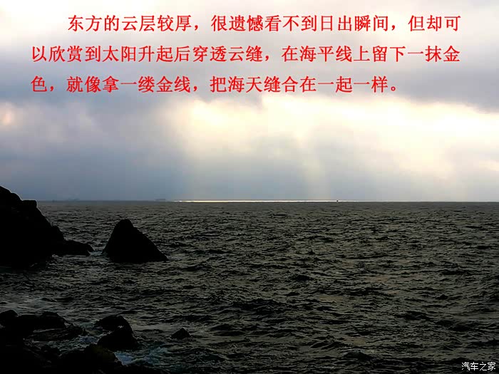 云层这么厚实,很遗憾看不到日出的瞬间,但随着太阳升起,阳光终于撕开一条云缝,在海平面上留下一抹金色,就像拿了一条金缕丝线,把海天缝合在一起一样,美丽极了。