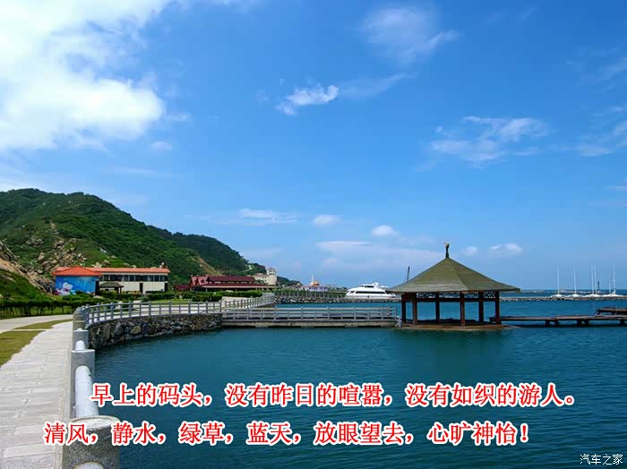 远看着有一对似乎是恋人的年轻男女相拥着走了过来,为了给他们让出空间,我跳下礁石,回到了小路上,缓步往酒店方向走去。早上的码头,没了昨日的喧嚣,没有如织的游人。清风,静水,绿草,蓝天,放眼望去,心旷神怡!