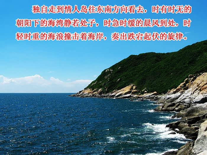 一个人独自走到情人岛上,站定往东南方向看去,时有时无的朝阳下的海湾静若处子,时急时缓的晨风到处,时轻时重的海浪撞击着海岸,奏出跌宕起伏的优雅旋律。