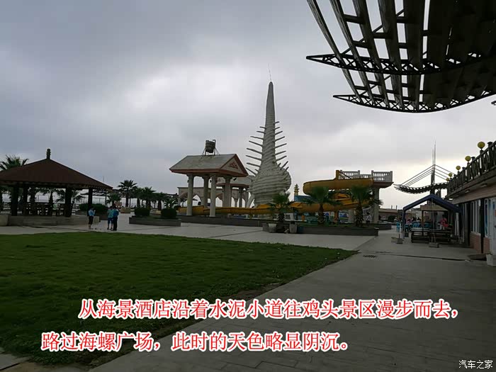 我们在鸡冠石景点酣畅淋漓的感受了一下海风海浪和海潮,退出来时天已经快黑了 ,骑着电动车返回到租车处还车,然后徒步走下来回到酒店门口。走到半山腰,不经意间抬眼一望,居然发现有一抹落日的余晖挤破乌云,泼洒在沙滩上,聊以慰藉未看到日落景色的我们。几家人商量着晚餐换换口味,改一家食肆尝尝,商量定了,就沿着门口的水泥小道,慢悠悠的行路出来。