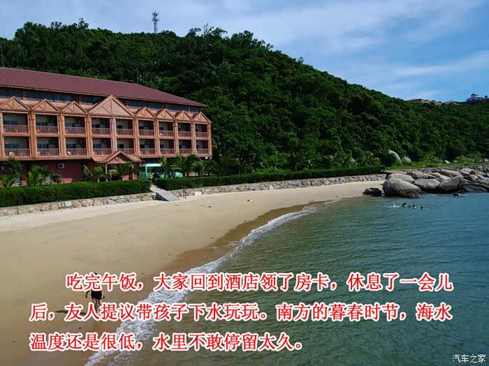 妻并未下水游泳,只是在浅水处用脚拨弄着清澈的海水和细腻的海沙,一段时间后感觉温度有些低,水里不能久留,要我们上岸。我半拉半劝的揪着儿子从水中上来,蹦跳着回到房间,美美的冲了个热水澡,换上干净衣服躺下。