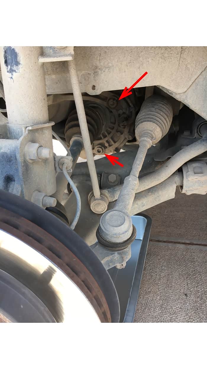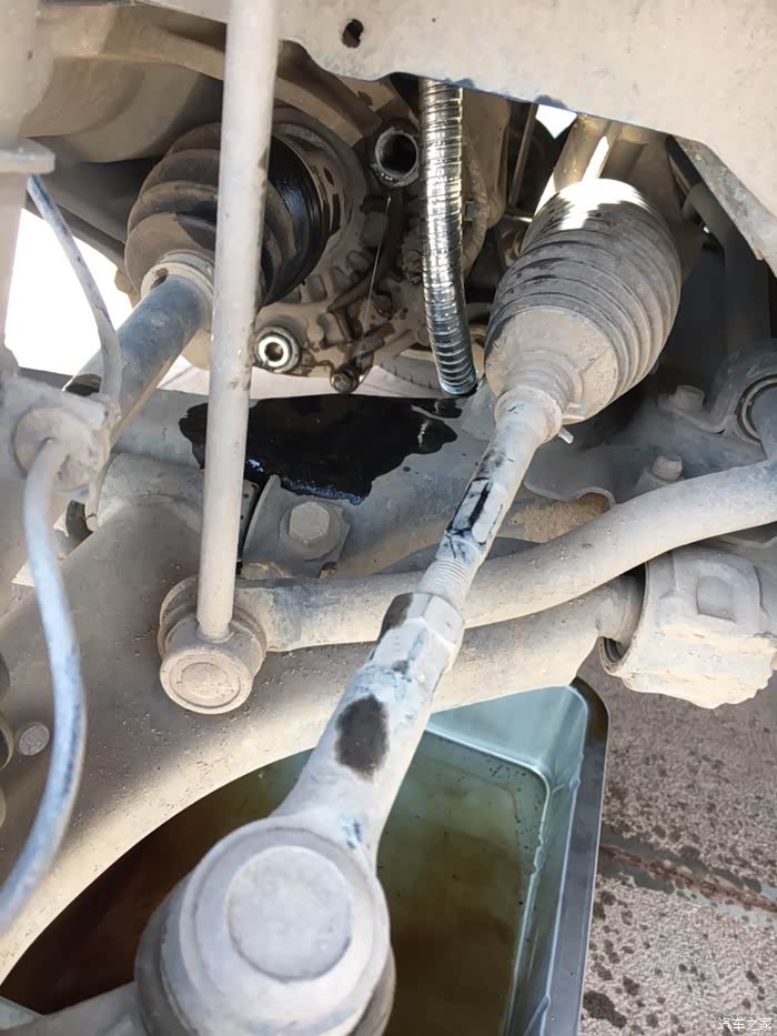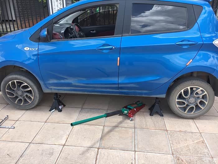 在撑起车身之前把左前轮螺丝打松,车辆撑起之后,卸掉左前轮,露出变速箱的放油螺丝和观察孔螺丝