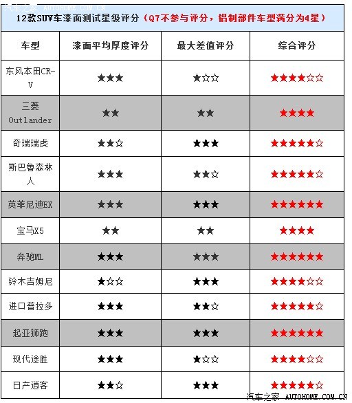 ● 12款SUV车型漆面测试星级评分(奥迪Q7因数量不足故不参与评分)