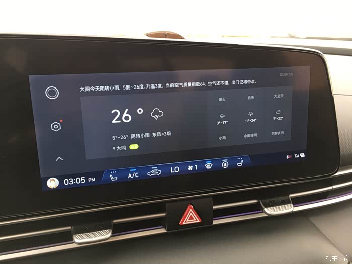 回到3个分屏页面,点击天气页面就会出现4天的天气预报,一进入天气页面,还会自动说出今天的天气情况,非常的智能,可以说北京现代对于咱们车主是用心了!