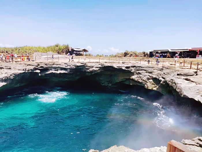 恶魔眼泪是蓝梦岛的最佳观潮地点和最美景点之一,该景点岸边的崖石下方有两个巨大的空洞(像是恶魔的两个眼睛),只要海浪涌来,就会激起十多米高的的水柱,尤为壮观,在阳光的折射下还能看到水雾中的彩虹。然而当天没有涨潮,海浪小,未能看到激起的浪花,有点遗憾。