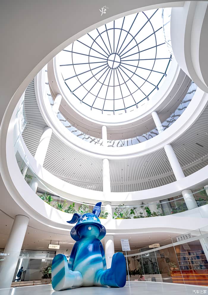 一进门就可以看到展厅中间有一个大大的兔子装置,并且旁边还有一个旋转式斜坡通往楼上,而且这里还放着一台老爷车E34,确实有点像慕尼黑的宝马博物馆里面的陈设以及布置~