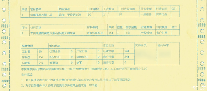 材料费 丰田纯牌防锈防冻液/超级耐久冷却液: 151元