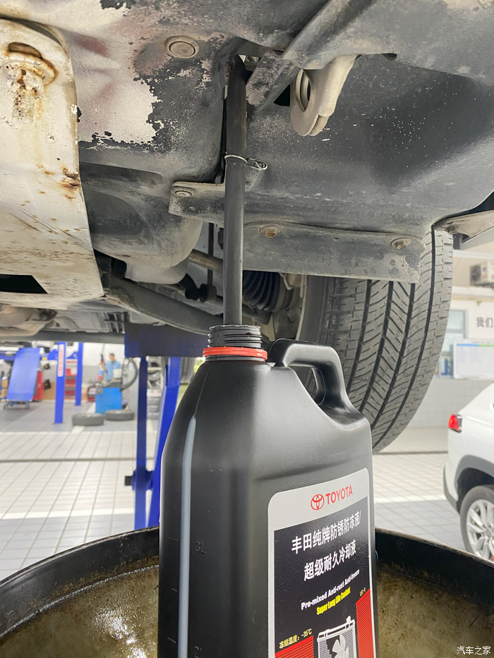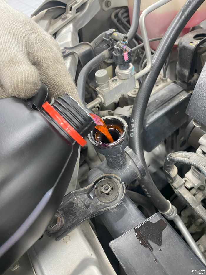 开始加注冷却液。水箱冷却液放下来还不到3L,所以贮液罐里的冷却液也一并换掉,正好用完。