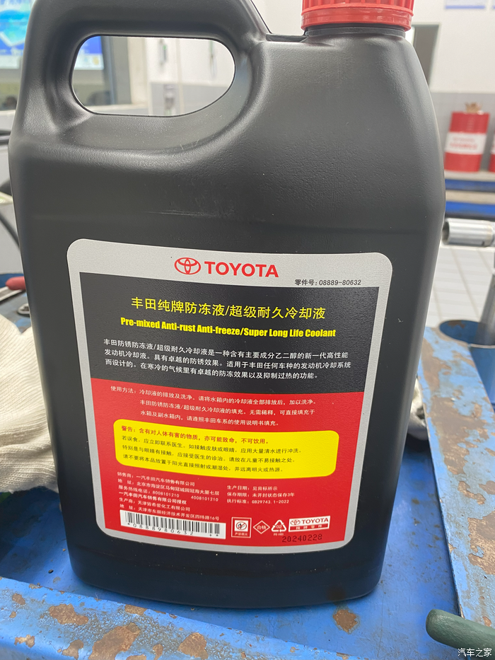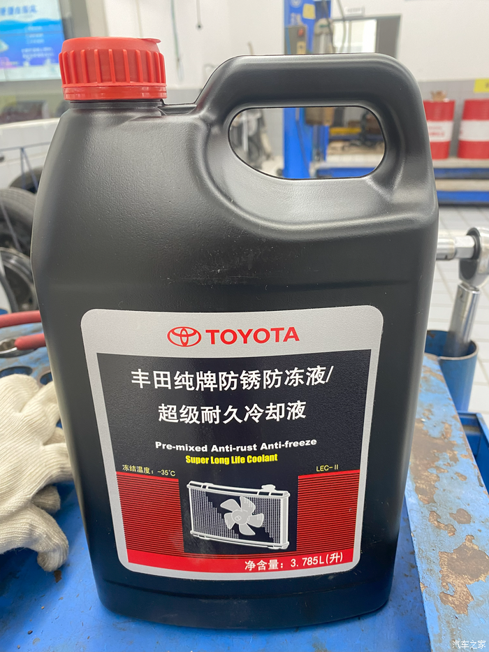 这是一汽丰田的纯牌冷却液,不知道和出厂时的冷却液是否一模一样。抖音里有位博主说会有不同,总之原车自带的最好。