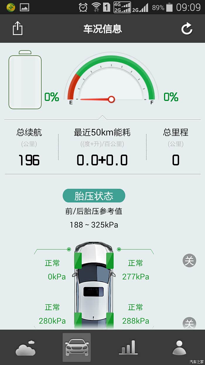 但我常常得到的就是这样的,电量、油量都是0,这肯定不是最后车况,(特奇怪,为什么老是左前轮胎压为零)能耗也看不到。