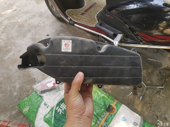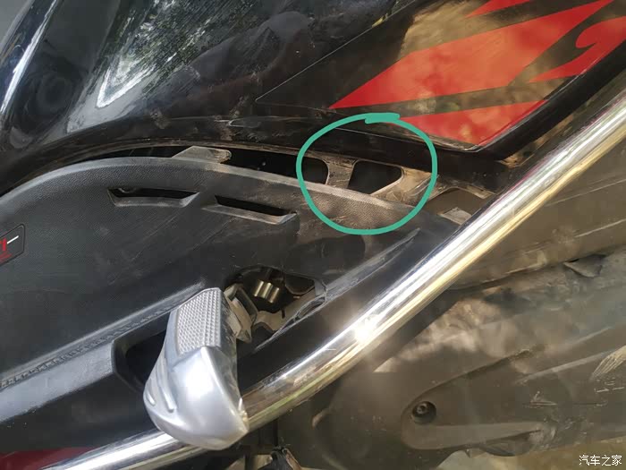 这个螺丝取下后,放好。开始搬动这个“水冷”的这块儿塑料覆盖件,尽量往前,即车把方向晃动,让其略微松动(去掉那两个固定螺丝后,这个覆盖件都是卡扣,没关系的,不用担心质量