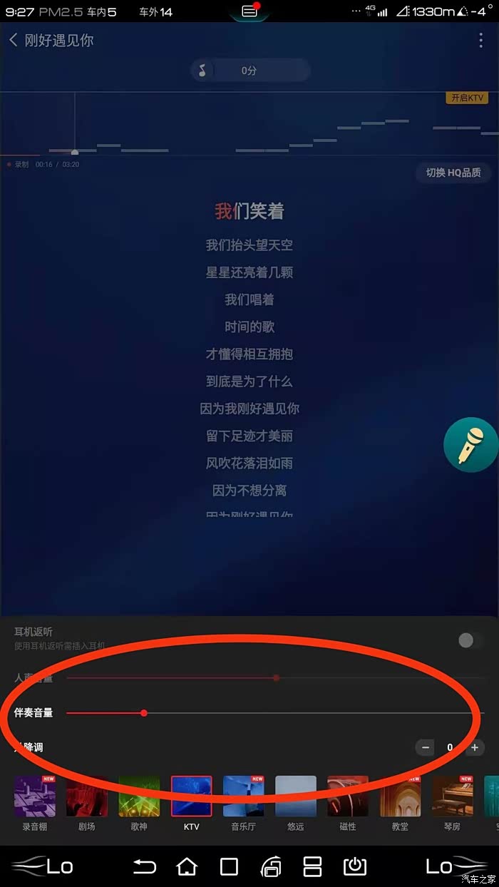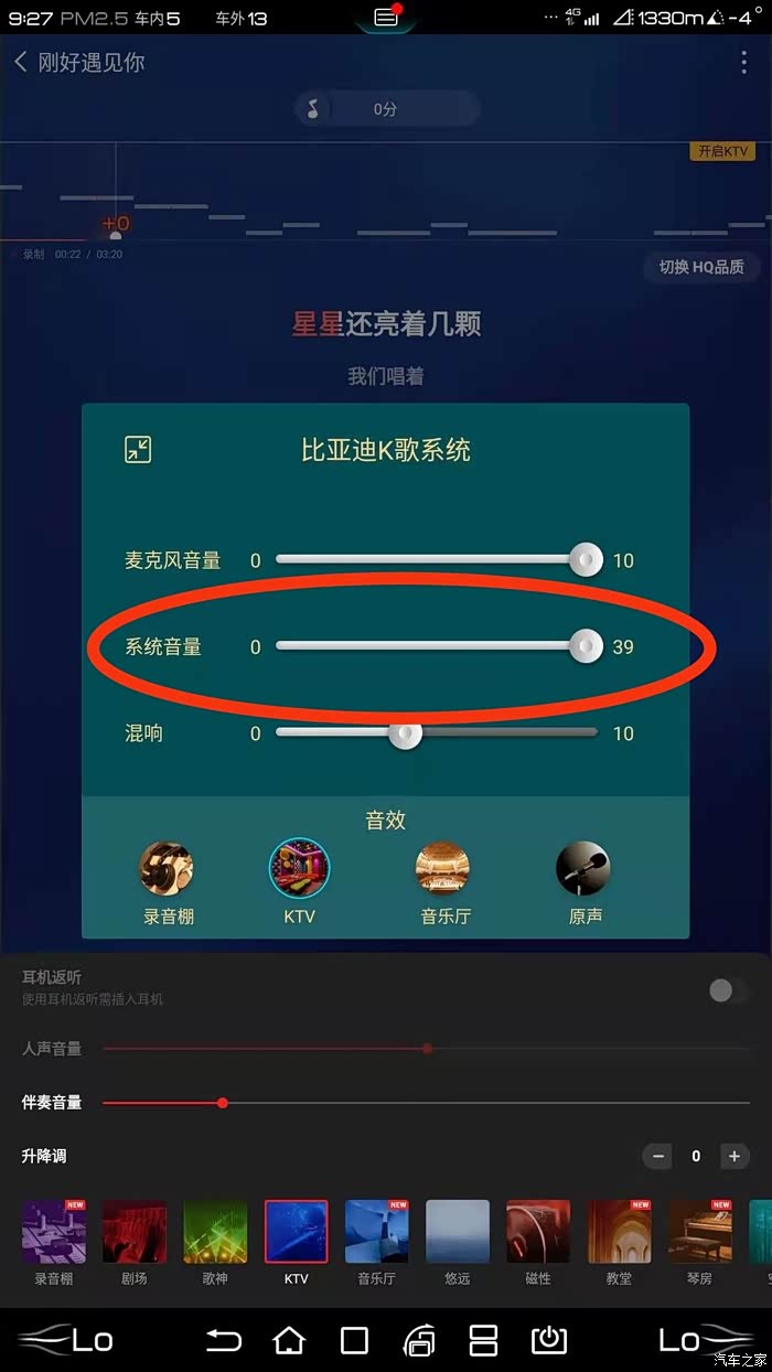 【当然有办法】,我目前摸索的是,打开k喝软件后,将伴奏音量调小就可以了(如图)。希望可以帮助到车友。