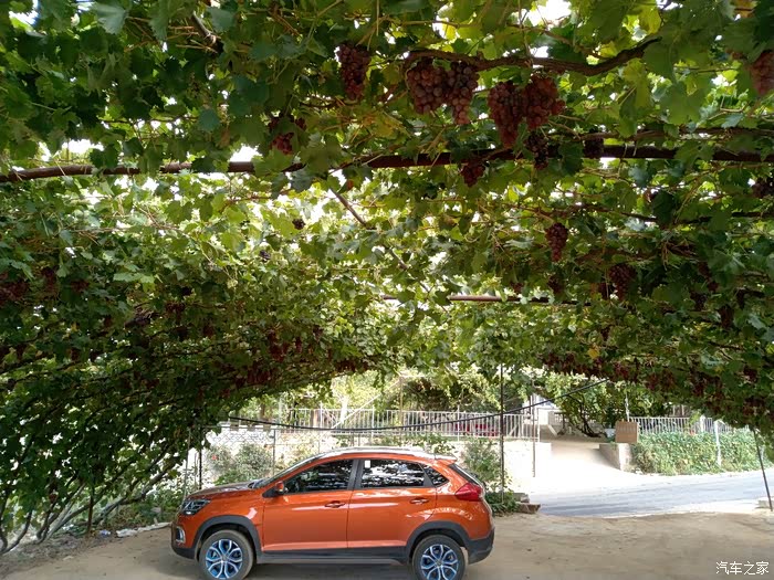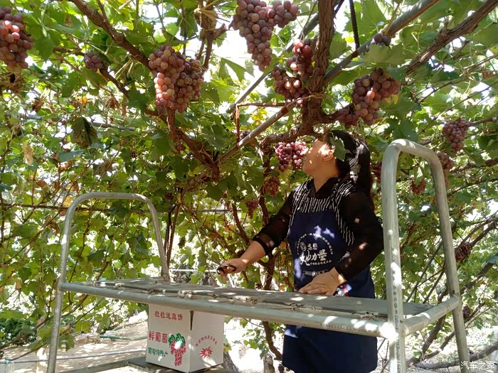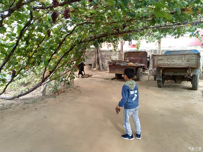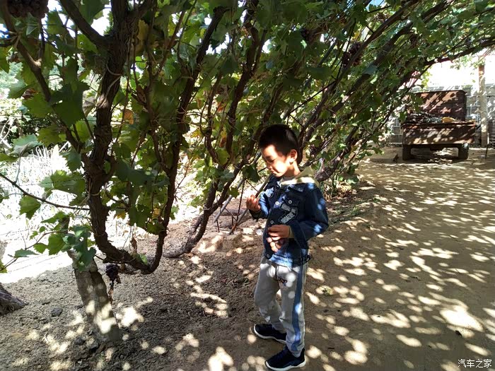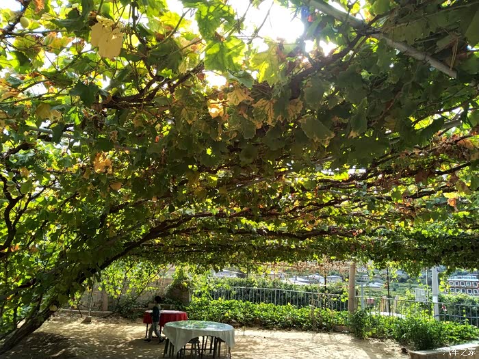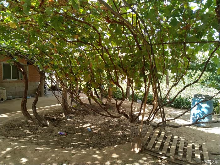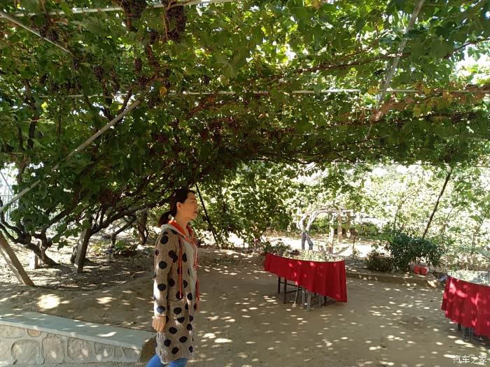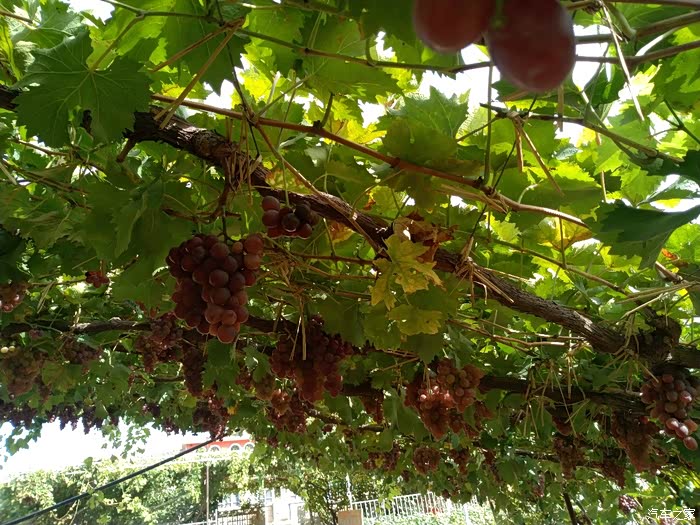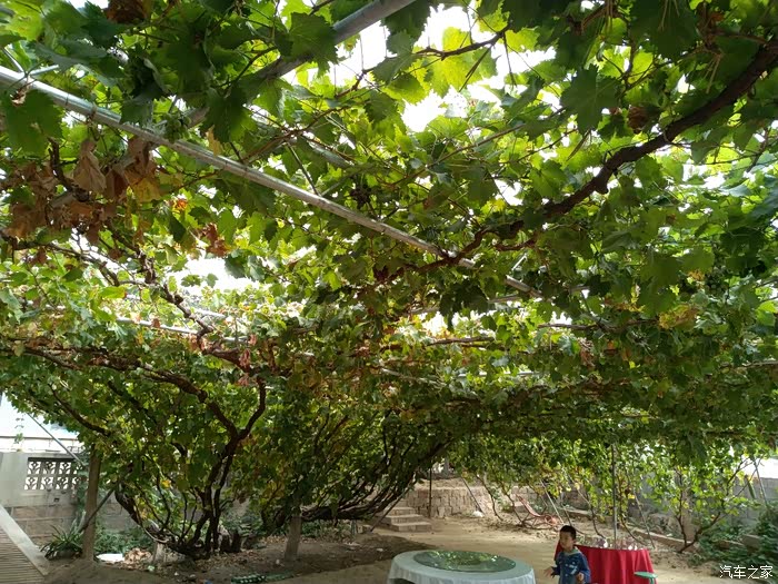 谁知。农家乐主人说自己另外一个采摘园还有一颗100年的葡萄树!我更是充满的惊讶。因为自己到葡萄地里去采摘,见到的也才都是三年左右的树岭,哪里见过这么长久的葡萄树啊。主人带我们围绕他的院子进行了参观,院子里的葡萄树至少也都有七八年了,虽然艳阳高照,但是,由于葡萄树太过繁茂,因此树底下,凉风习习。站在农家院口,远眺山峦叠张,这依山傍水、乘荫纳凉的生活,可真是惬意啊!