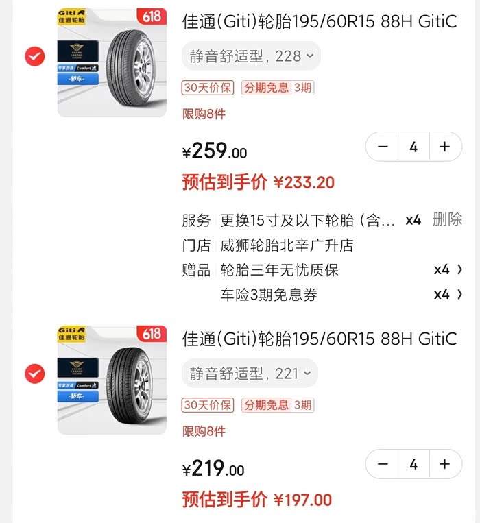 物美价廉看了佳通195/60/15,花纹不同221/228,重量也不同7.75公斤/8.3公斤,价格分别是197元/223元。韩泰的好像260左右。