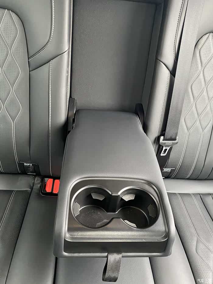 后排座椅挺宽大的,靠背也很舒服,中间还设计了一个双联体的水杯架,蛮人性化的。