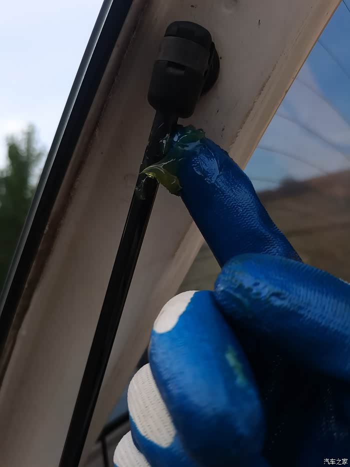 两个支撑杆擦拭干净以后,再用干净的白布把撑杆上的缝纫机油擦拭干净。带上手套手指沾黄油均匀的在支撑杆上涂抹。