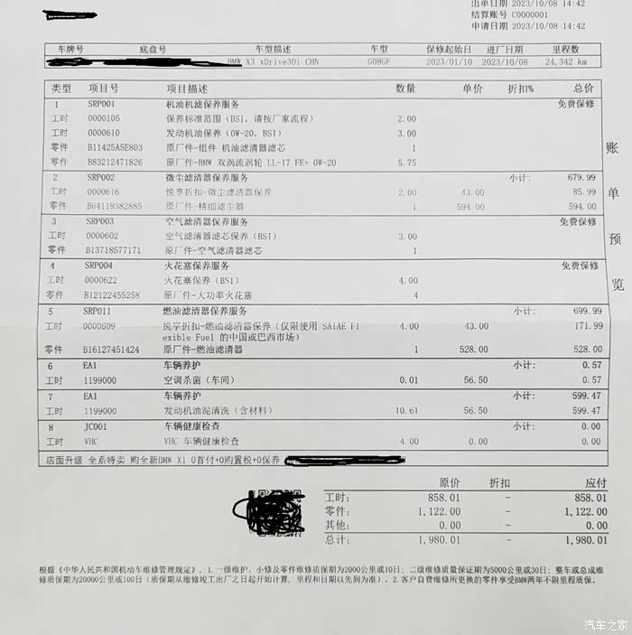 来说说二保情况,共做了6个项目,分别是:机油机滤更换(免费)、车内空气滤芯也就是空调格更换(680块)、空气滤清器更换(免费)、火花塞更换(免费),燃油滤清器更换(700块),空调杀菌(免费)、发动机油泥清洗(600块),一共1980。