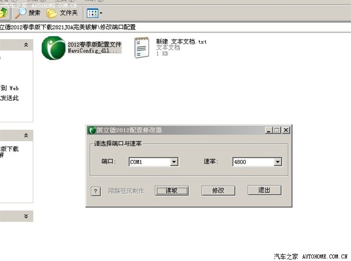 将 NaviConfig.dll文件复制到和凯立德2012配置修改器.exe文件同目录下。然后运行 凯立德2012配置修改器.exe文件 点读取,读取到现在默认的端口和波特率,如果和你机器的端口和波特率不一致,就修改到一致,点修改即可