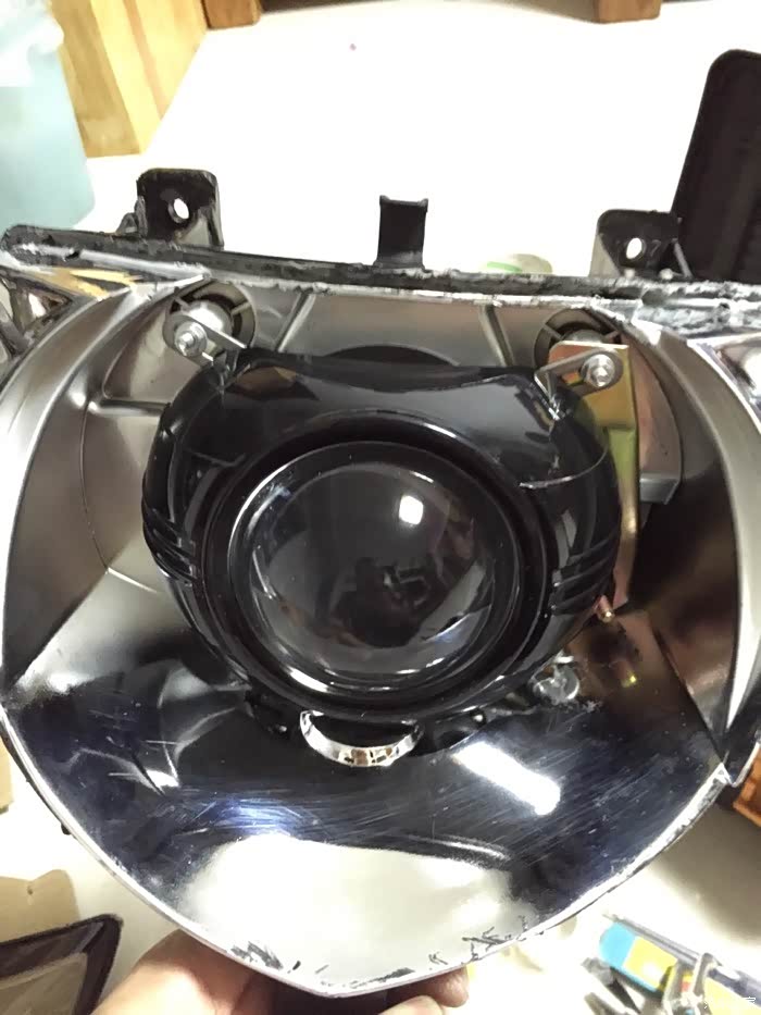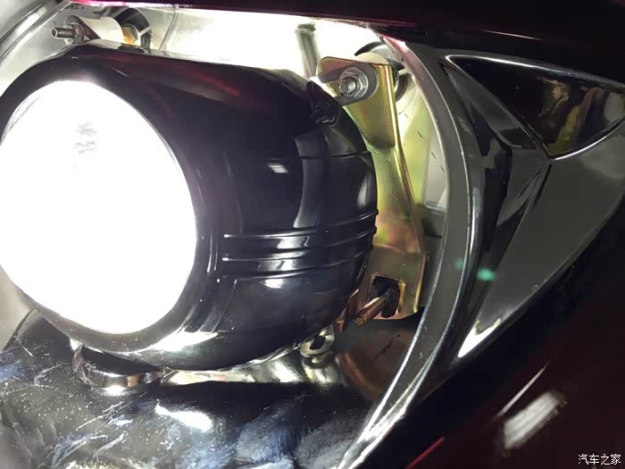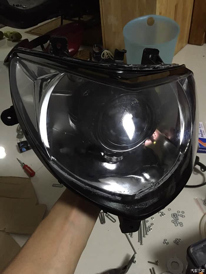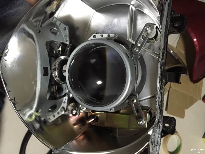 无奈只有二次开灯,狠心直接去掉灯碗,没想到拨开云雾见彩虹,用转接片,能直接无损把透镜安装在原装位置,甚至移植了灯碗上的高低调节支架,完美实现灯光调节。