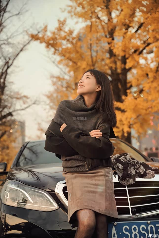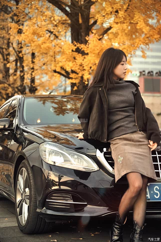 这辆奔驰W212已走过十余年,流畅的腰线与立标前脸至今仍不过时。选择在会展城的停车场拍摄,是因为这里视野开阔,现代建筑与自然景致的碰撞恰好呼应了W212“沉稳中带锋芒”的气质。媳妇轻轻倚在车头,深色外套与车身的金属漆面形成微妙对比,而银杏叶恰好飘落在引擎盖上,仿佛时光在提醒:经典从不因岁月褪色。