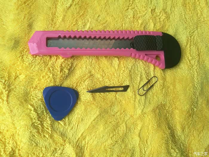 在办公室搜罗一圈,发现了四个工具:美工刀,三角撬片,小刀片,回形针。我觉得这几个都可以拆,但是还是要看实际效果。