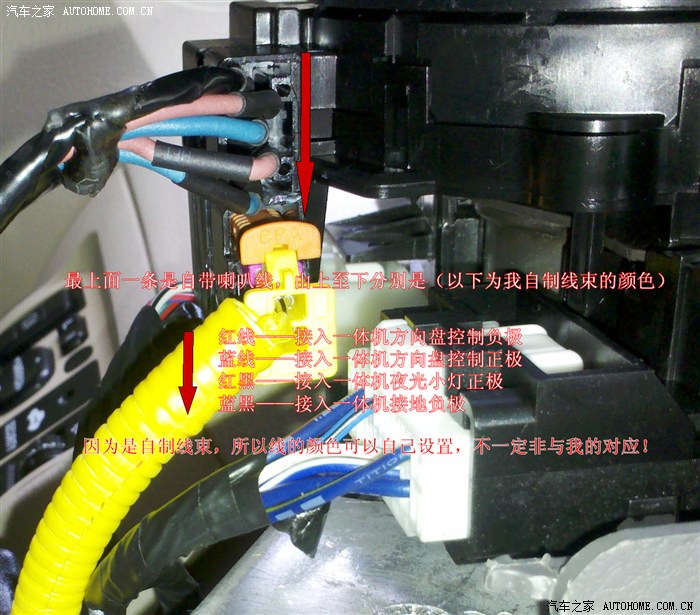 将线束从方向盘下面穿进来,线束不用太长。我的约四十厘米。这边同样是对应的四个颜色。和上面的图中是对应的