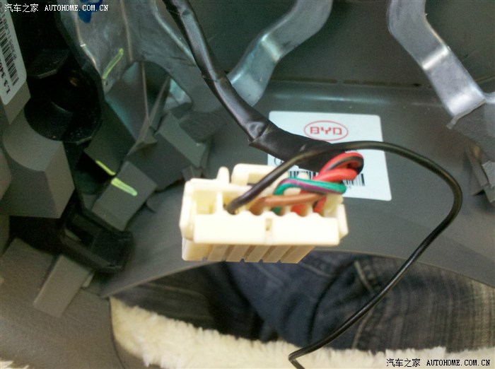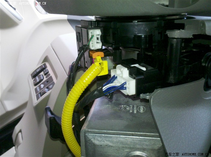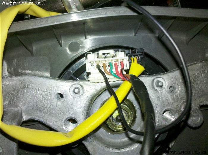 先将上面线束一头接入方向盘下部插头中。至于插针做法暂略过。因为线是临时接上,所以线序乱些,大家只需记住图中所示顺序即可。