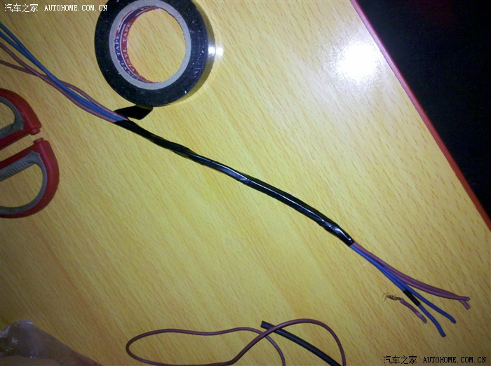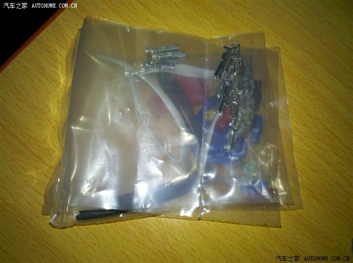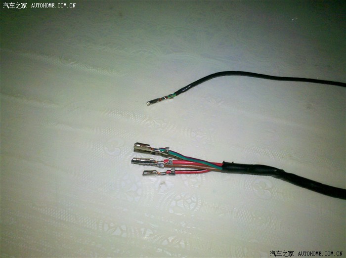 这是上部插针的线序,从图上的左至右依次为,喇叭线,土黄,绿混,红,红黑。用的是方向盘配套小线束