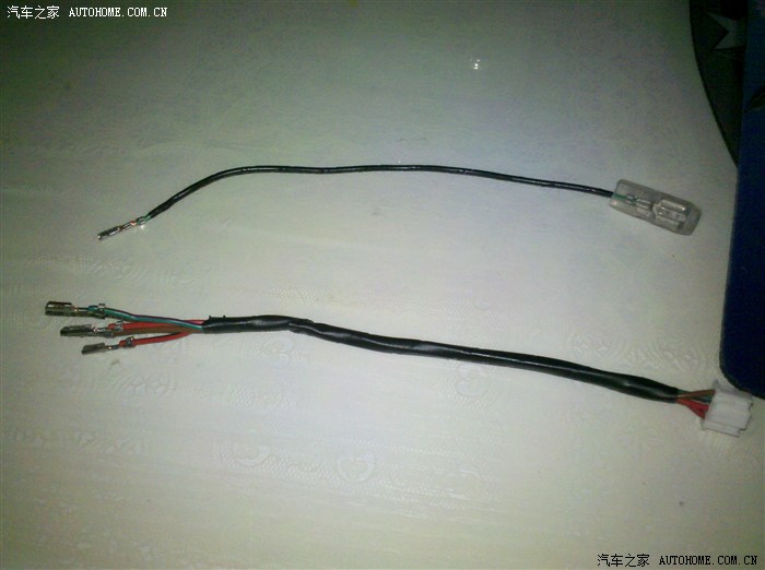 先上图,方向盘附带的两线束。上面一根是喇叭线,原车上有,就是方向盘上面那个插头上带的。这根用不着,另一根是方向盘小线束,一头插方向盘上面的大插头,一头插多功能方向盘上。右侧白色直接插到多功能方向盘上,另一头要加工一下,因为这个插针和方向盘上面的大插头不配套。